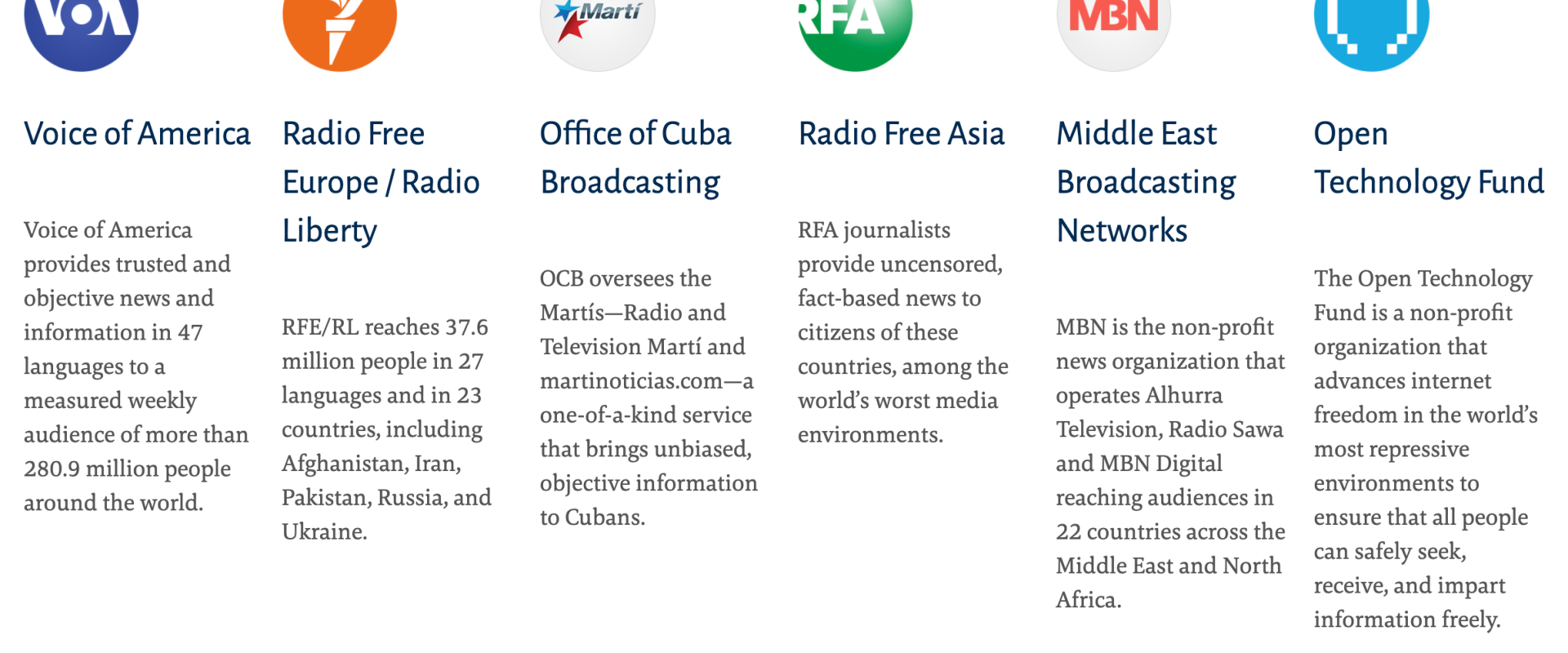 الوكالة الأمريكية التي تم تشكيلها في بداية شهر أكتوبر / تشرين أول عام 1999 تهدف إلى "إعلام وإشراك وربط الناس حول العالم لدعم الحرية والديمقراطية دعما للمصالح الوطنية للولايات المتحدة الأمريكية"، وتشرف على عمل وسائل إعلام عديدة هي: صوت أمريكا (VOA)، إذاعة أوروبا الحرة، إذاعة الحرية، راديو ذا مارتي، وراديو آسيا الحرة، وشبكة تلفزيون الشرق الأوسط (MBN) التي تضم كل تلفزيون الحرة والحرة العراق وراديو سوا والعديد من الشبكات الرقمية.