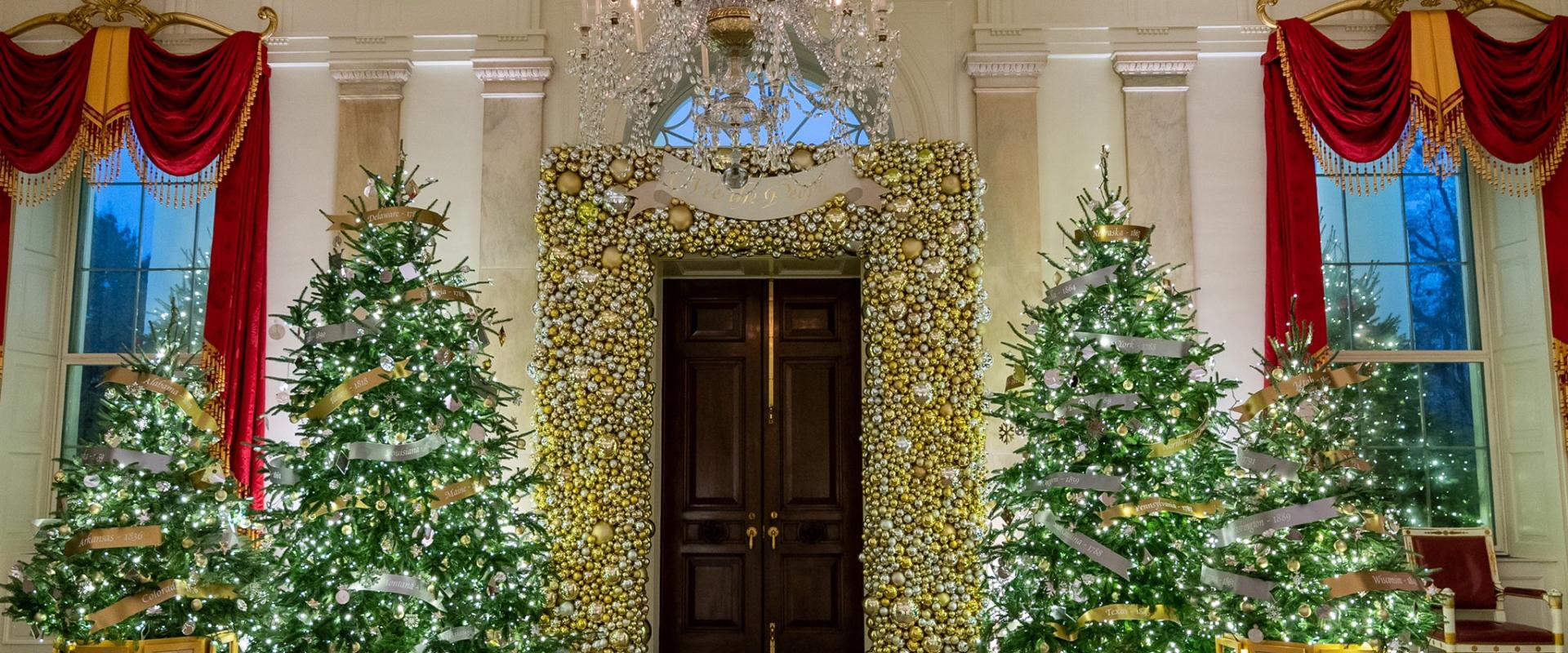 الزخارف والحلي العاكسة التي تحمل أسماء أفراد الخدمة العسكرية الذين قُتلوا في ساحات المعارك تطوق الأشجار في ردهة الجناح الشرقي.