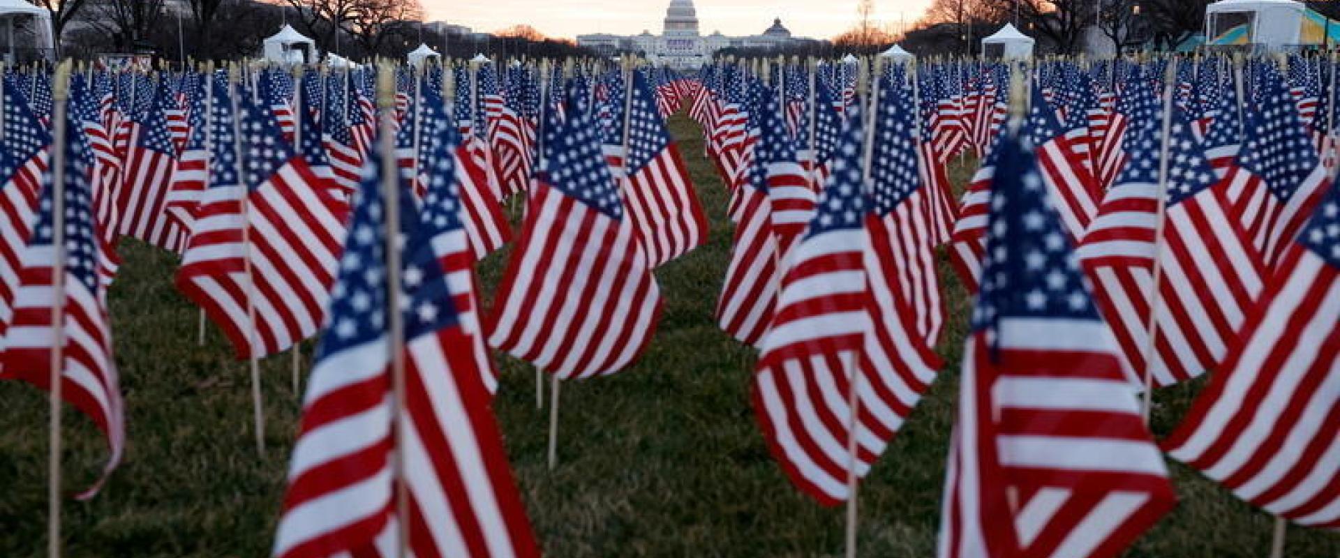 المنطقة العشبية التي سيؤدي فيها كل من بايدن وهاريس اليمين اليمين الدستورية، امتلأت بنحو 200 ألف علم أمريكي، وذلك لتمثيل الأعداد التي عادة ما تحضر حفل التنصيب والتي لم تتمكن هذا العام بسبب الظروف التي فرضها انتشار الوباء، إضافة إلى 56 عمودًا مضيئا يمثلون الولايات والأقاليم الأمريكية.