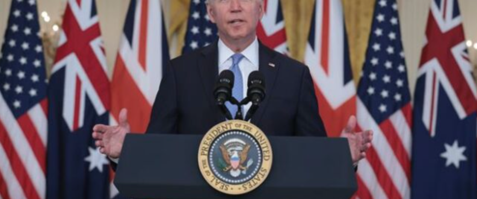 وأعلن الرئيس الأمريكي جو بايدن رسميًا عن الاتفاق في بيان للصحفيين عقده في البيت الأبيض، شارك فيه عن بعد من خلال شاشات تلفزيونية كبيرة كل من رئيس الوزراء الأسترالي سكوت موريسون ورئيس الوزراء البريطاني بوريس جونسون.