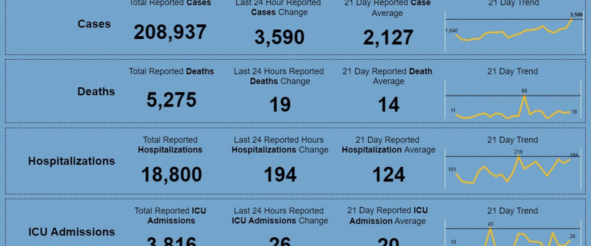 كما سجلت الولاية 19 وفاة ليصل الإجمالي إلى 5,275 حالة، بينما دخل 194 شخصا إلى المستشفيات لتلقي العلاج، وهو ثالث أعلى معدل تم الإبلاغ عنه حتى الآن.