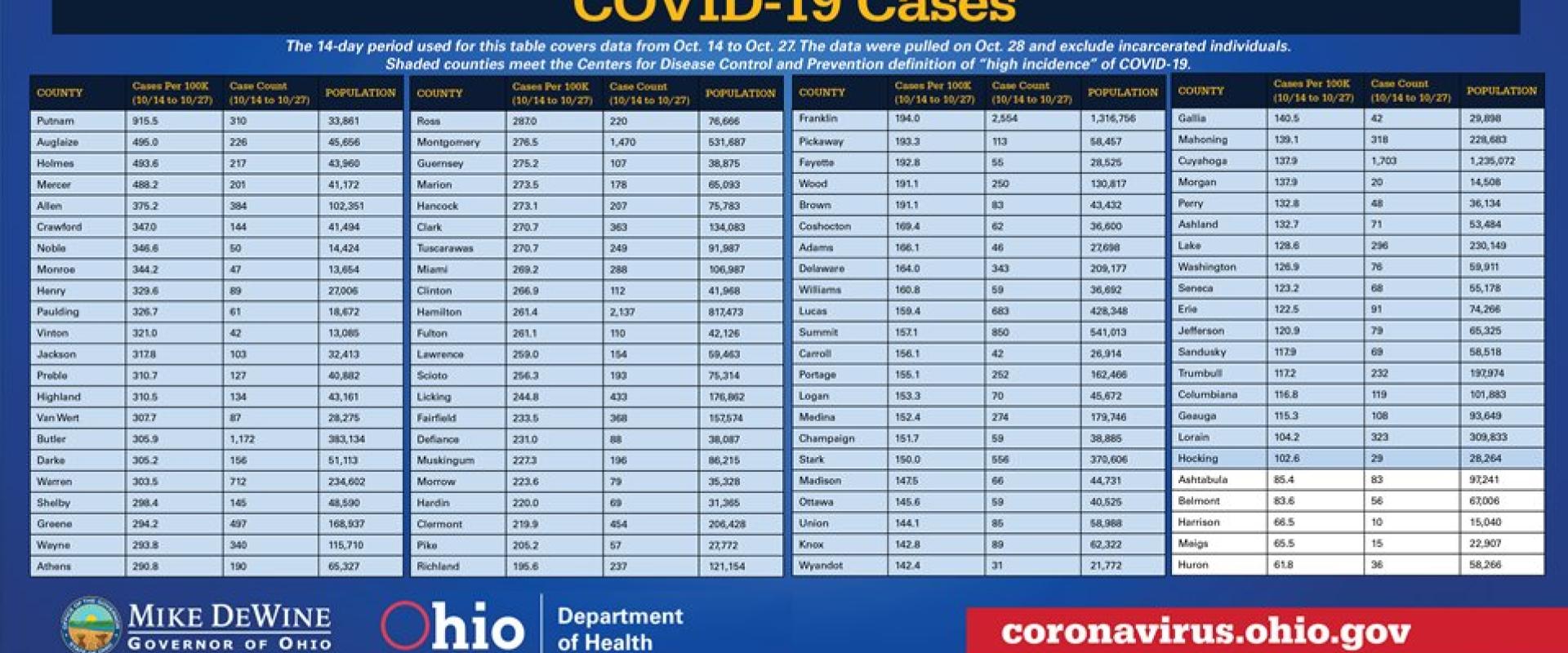 سجلت دائرة وزارة الصحة في أوهايو اليوم 3,590 إصابة جديدة بفيروس كورونا خلال الساعات 24 الماضية، وهو رقم غير مسبوق في الولاية، يزيد بنسبة 25٪ عن الرقم القياسي السابق.