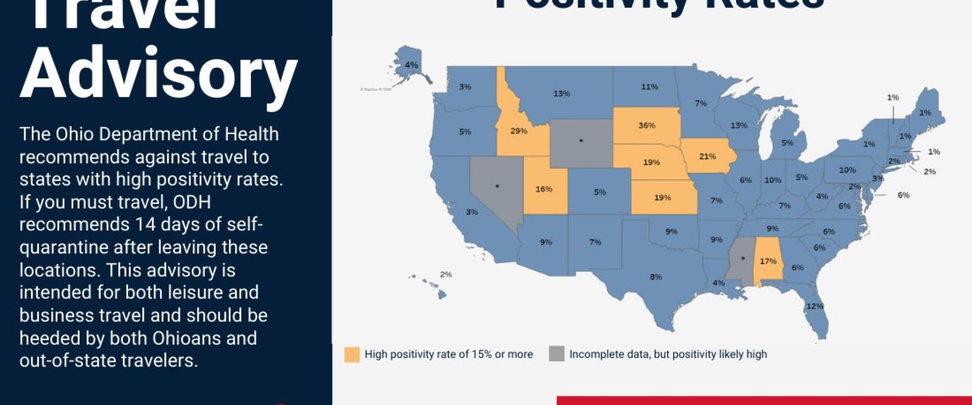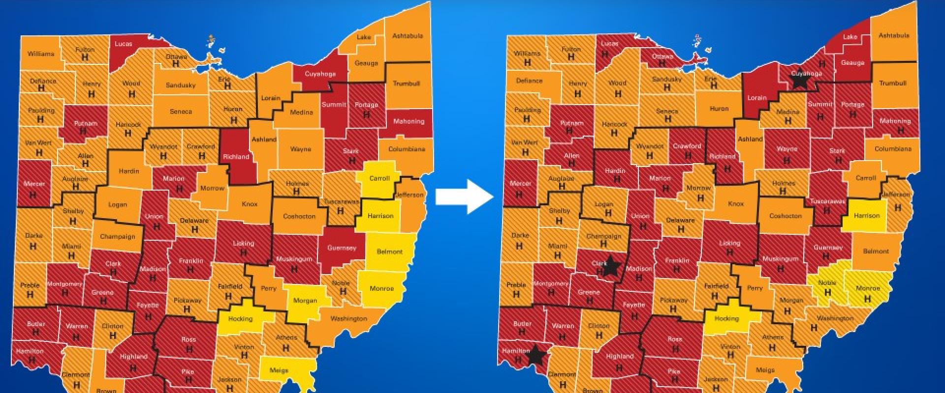 خلال حديثه عن آخر مستجدات المتعلقة بانتشار الوباء، قال حاكم ولاية أوهايو مايك دواين بعد ظهر اليوم إن وضعنا في تدهور، مضيفاً بأن عدد الإصابات هو الأعلى الذي يتم الإبلاغ عنه في يوم واحد منذ بدء انتشار الوباء، بينما دخلت 38 مقاطعة إلى مقياس اللون الأحمر بحسب النظام الاستشاري المتعلق بانتشار الفيروس في الولاية.