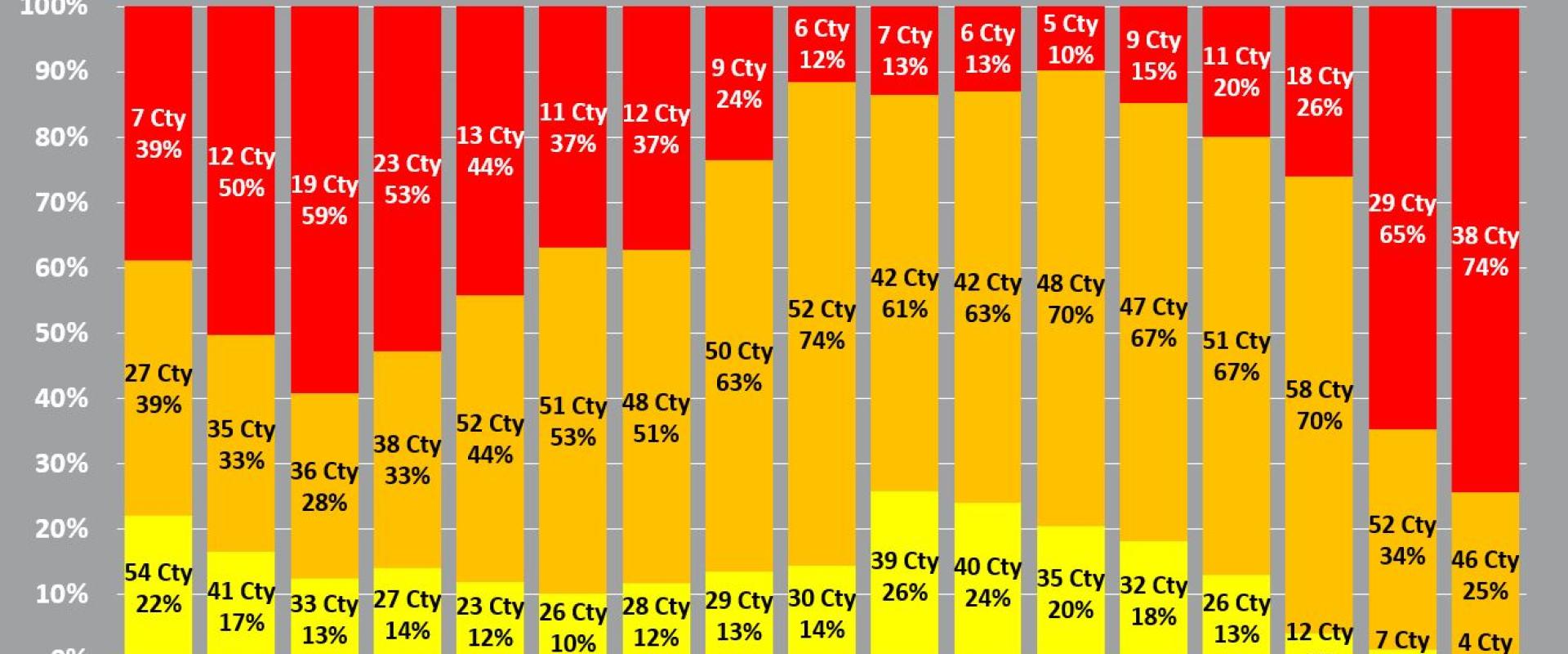 وأضاف دواين، أن 92.8٪ من سكان ولاية أوهايو يعيشون الآن في مقاطعات مصنفة حمراء أو ذات معدل مرتفع.